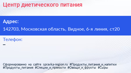 Центр диетического питания по адресу 142703, Московская область, Видное, 6-я линия, ст20 в дальнейшем Организация, размещена в следующих категориях: