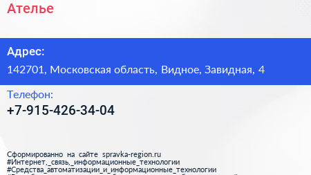 Ателье по адресу 142701, Московская область, Видное, Завидная, 4 в дальнейшем Организация, размещена в следующих категориях: