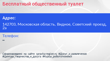 Бесплатный общественный туалет по адресу 142703, Московская область, Видное, Советский проезд, 2а в дальнейшем Организация, размещена в следующих категориях: