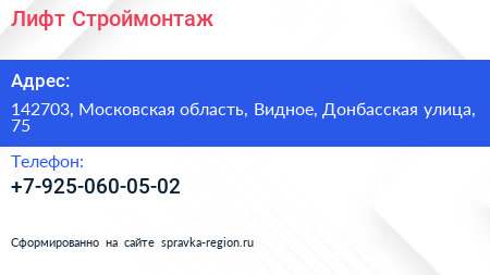 Лифт-Строймонтаж по адресу 142703, Московская область, Видное, Донбасская улица, 75 в дальнейшем Организация, размещена в следующих категориях: