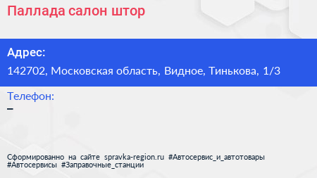 Паллада, салон штор по адресу 142702, Московская область, Видное, Тинькова, 1/3 в дальнейшем Организация, размещена в следующих категориях: