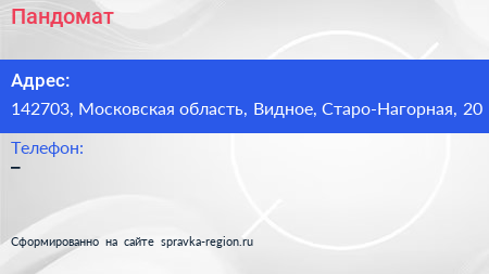 Пандомат по адресу 142703, Московская область, Видное, Старо-Нагорная, 20 в дальнейшем Организация, размещена в следующих категориях: