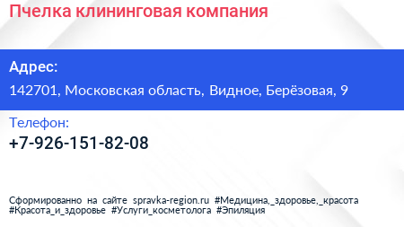 Пчелка, клининговая компания по адресу 142701, Московская область, Видное, Берёзовая, 9 в дальнейшем Организация, размещена в следующих категориях: