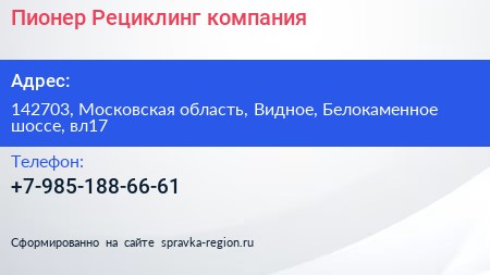 Пионер Рециклинг, компания по адресу 142703, Московская область, Видное, Белокаменное шоссе, вл17 в дальнейшем Организация, размещена в следующих категориях:
