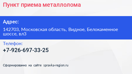 Пункт приема металлолома по адресу 142703, Московская область, Видное, Белокаменное шоссе, вл3 в дальнейшем Организация, размещена в следующих категориях: