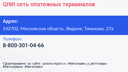 QIWI, сеть платежных терминалов по адресу 142702, Московская область, Видное, Тинькова, 27а в дальнейшем Организация, размещена в следующих категориях: