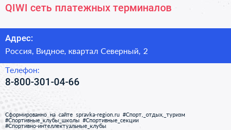 QIWI, сеть платежных терминалов по адресу Торговый центр "ЭкоВидное", 2, квартал Северный, микрорайон Купелинка, 6-й микрорайон, Ленинский городской округ, Московская область, Центральный федеральный округ, 152701, Россия в дальнейшем Организация, размещена в следующих категориях: