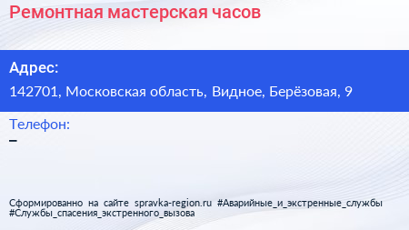 Ремонтная мастерская часов по адресу 142701, Московская область, Видное, Берёзовая, 9 в дальнейшем Организация, размещена в следующих категориях: