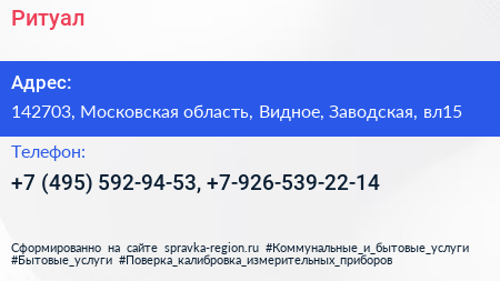 Ритуал по адресу 142703, Московская область, Видное, Заводская, вл15 в дальнейшем Организация, размещена в следующих категориях: