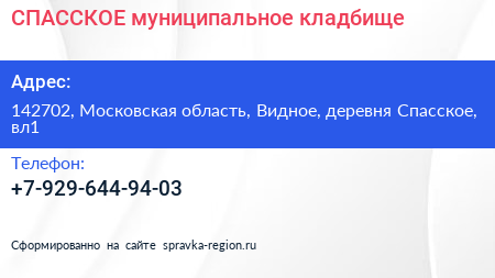СПАССКОЕ, муниципальное кладбище по адресу 142702, Московская область, Видное, деревня Спасское, вл1 в дальнейшем Организация, размещена в следующих категориях: