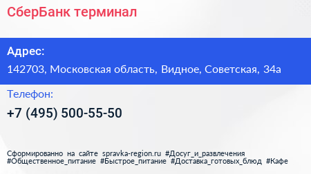 СберБанк, терминал по адресу 142703, Московская область, Видное, Советская, 34а в дальнейшем Организация, размещена в следующих категориях: