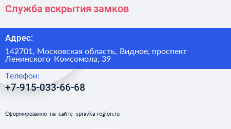 Служба вскрытия замков по адресу 142701, Московская область, Видное, проспект Ленинского Комсомола, 39 в дальнейшем Организация, размещена в следующих категориях: