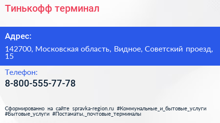 Тинькофф, терминал по адресу 142700, Московская область, Видное, Советский проезд, 15 в дальнейшем Организация, размещена в следующих категориях: