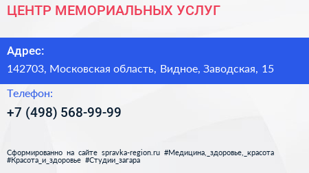 ЦЕНТР МЕМОРИАЛЬНЫХ УСЛУГ по адресу 142703, Московская область, Видное, Заводская, 15 в дальнейшем Организация, размещена в следующих категориях: