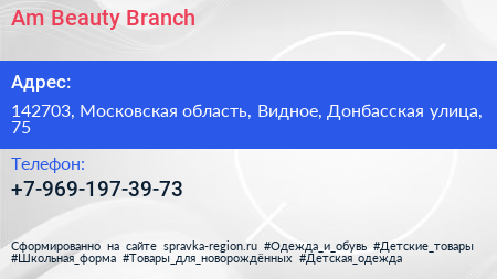 Am Beauty Branch по адресу 142703, Московская область, Видное, Донбасская улица, 75 в дальнейшем Организация, размещена в следующих категориях: