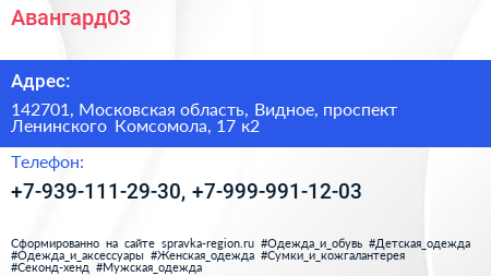 Авангард03 по адресу 142701, Московская область, Видное, проспект Ленинского Комсомола, 17 к2 в дальнейшем Организация, размещена в следующих категориях: