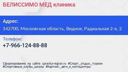 БЕЛИССИМО-МЕД, клиника по адресу 142700, Московская область, Видное, Радиальная 2-я, 2 в дальнейшем Организация, размещена в следующих категориях:
