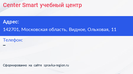 Center Smart, учебный центр по адресу 142701, Московская область, Видное, Ольховая, 11 в дальнейшем Организация, размещена в следующих категориях:
