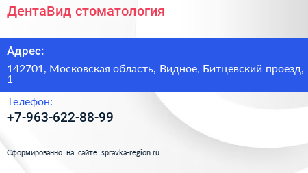 ДентаВид, стоматология по адресу 142701, Московская область, Видное, Битцевский проезд, 1 в дальнейшем Организация, размещена в следующих категориях: