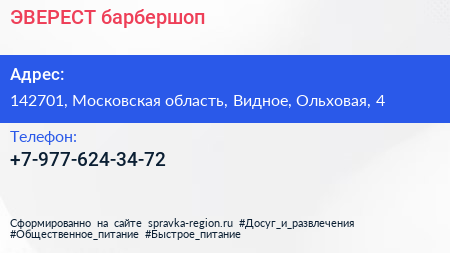 ЭВЕРЕСТ, барбершоп по адресу 142701, Московская область, Видное, Ольховая, 4 в дальнейшем Организация, размещена в следующих категориях: