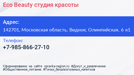 Eco Beauty, студия красоты по адресу 142701, Московская область, Видное, Олимпийская, 6 к1 в дальнейшем Организация, размещена в следующих категориях: