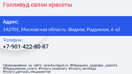 Голливуд, салон красоты по адресу 142701, Московская область, Видное, Радужная, 6 к2 в дальнейшем Организация, размещена в следующих категориях: