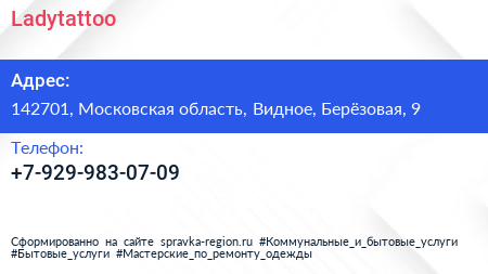 Ladytattoo по адресу 142701, Московская область, Видное, Берёзовая, 9 в дальнейшем Организация, размещена в следующих категориях: