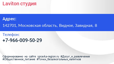 Laviton, студия по адресу 142701, Московская область, Видное, Завидная, 8 в дальнейшем Организация, размещена в следующих категориях: