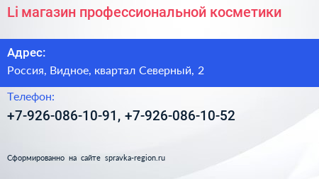 Li, магазин профессиональной косметики по адресу Торговый центр "ЭкоВидное", 2, квартал Северный, Эко Видное, Сапроново, Ленинский городской округ, Московская область, Центральный федеральный округ, 142701, Россия в дальнейшем Организация, размещена в следующих категориях: