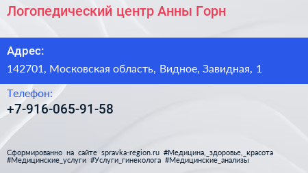 Логопедический центр Анны Горн по адресу 142701, Московская область, Видное, Завидная, 1 в дальнейшем Организация, размещена в следующих категориях: