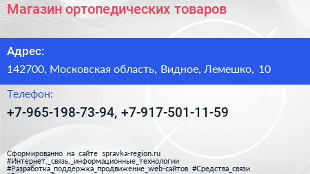 Магазин ортопедических товаров по адресу 142700, Московская область, Видное, Лемешко, 10 в дальнейшем Организация, размещена в следующих категориях: