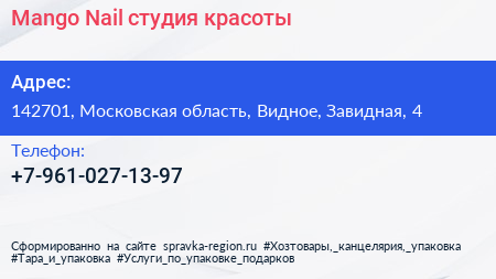 Mango Nail, студия красоты по адресу 142701, Московская область, Видное, Завидная, 4 в дальнейшем Организация, размещена в следующих категориях: