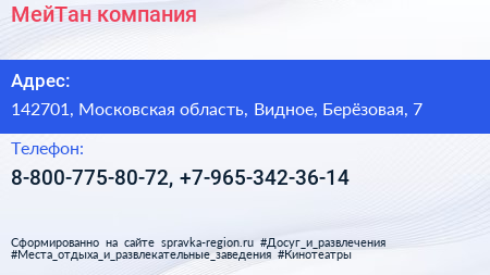 МейТан, компания по адресу 142701, Московская область, Видное, Берёзовая, 7 в дальнейшем Организация, размещена в следующих категориях: