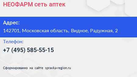 НЕОФАРМ, сеть аптек по адресу 142701, Московская область, Видное, Радужная, 2 в дальнейшем Организация, размещена в следующих категориях: