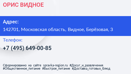 ОРИС-ВИДНОЕ по адресу 142701, Московская область, Видное, Берёзовая, 3 в дальнейшем Организация, размещена в следующих категориях: