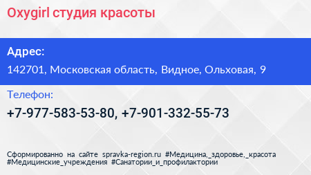 Oxygirl, студия красоты по адресу 142701, Московская область, Видное, Ольховая, 9 в дальнейшем Организация, размещена в следующих категориях: