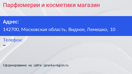 Парфюмерии и косметики, магазин по адресу 142700, Московская область, Видное, Лемешко, 10 в дальнейшем Организация, размещена в следующих категориях: