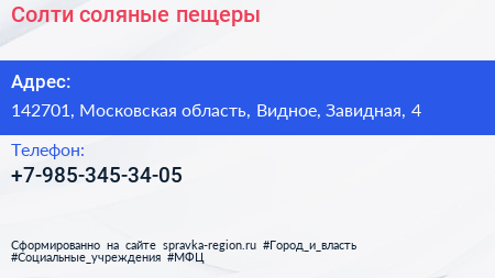 Солти, соляные пещеры по адресу 142701, Московская область, Видное, Завидная, 4 в дальнейшем Организация, размещена в следующих категориях: