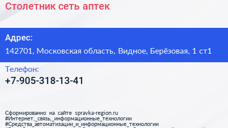 Столетник, сеть аптек по адресу 142701, Московская область, Видное, Берёзовая, 1 ст1 в дальнейшем Организация, размещена в следующих категориях: