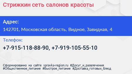 Стрижкин, сеть салонов красоты по адресу 142701, Московская область, Видное, Завидная, 4 в дальнейшем Организация, размещена в следующих категориях: