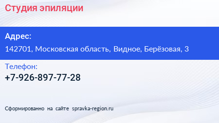 Студия эпиляции по адресу 142701, Московская область, Видное, Берёзовая, 3 в дальнейшем Организация, размещена в следующих категориях: