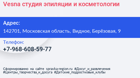 Vesna, студия эпиляции и косметологии по адресу 142701, Московская область, Видное, Берёзовая, 9 в дальнейшем Организация, размещена в следующих категориях: