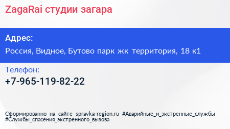 ZagaRai, студии загара по адресу Торговый центр "Мармелад", 18 к1, Жилой комплекс «Бутово-Парк», Бутово, Новодрожжино, Ленинский городской округ, Московская область, Центральный федеральный округ, 142718, Россия в дальнейшем Организация, размещена в следующих категориях: