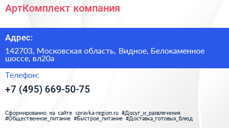 АртКомплект, компания по адресу 142703, Московская область, Видное, Белокаменное шоссе, вл20а в дальнейшем Организация, размещена в следующих категориях: