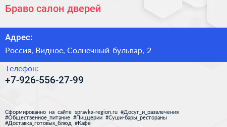 Браво, салон дверей по адресу 2, Солнечный бульвар, Жилой комплекс «Государев дом», Лопатино, Ленинский городской округ, Московская область, Центральный федеральный округ, 142710, Россия в дальнейшем Организация, размещена в следующих категориях: