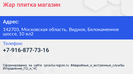 Жар плитка, магазин по адресу 142703, Московская область, Видное, Белокаменное шоссе, 10 вл2 в дальнейшем Организация, размещена в следующих категориях: