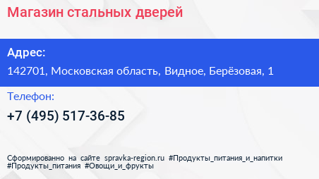 Магазин стальных дверей по адресу 142701, Московская область, Видное, Берёзовая, 1 в дальнейшем Организация, размещена в следующих категориях:
