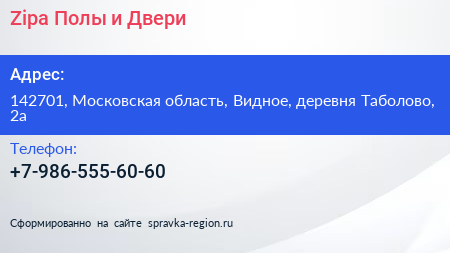 Zipa Полы и Двери по адресу 142701, Московская область, Видное, деревня Таболово, 2а в дальнейшем Организация, размещена в следующих категориях: