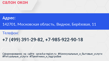 салон окон по адресу 142701, Московская область, Видное, Берёзовая, 11 в дальнейшем Организация, размещена в следующих категориях: