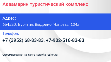 Аквамарин, туристический комплекс по адресу 664520, Бурятия, Выдрино, Чапаева, 104а в дальнейшем Организация, размещена в следующих категориях: